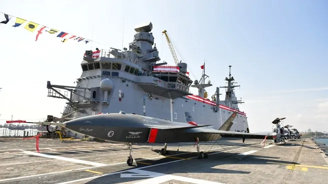 Başkan Recep Tayyip Erdoğan'ın katılımıyla 10 Nisan Pazartesi günü hizmete alınacak olan TCG Anadolu göreve hazır. Bu kapsamda Milli Savunma Bakanlığı (MSB) yeni bir fotoğraf servis etti. Çarpıcı karede TCG Anadolu üzerinde Bayraktar TB3 SİHA ve Kızılelma ile ATAK yer aldı. Dünyada bu ölçekte gemiye sahip 12 ülke bulunuyor. TCG Anadolu, üzerine iniş-kalkış yapacak SİHA'larla dünyanın "ilk SİHA gemisi" olacak. Uçuş güvertesinde 10 helikopter veya 11 SİHA konuşlandırılabilecek, hangarda ise 19 helikopter veya 30 SİHA taşınabilecek.