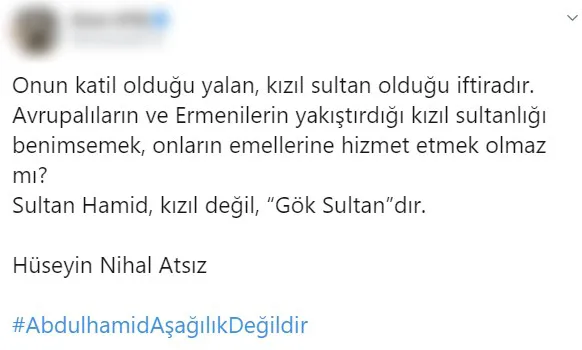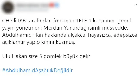Sözde gazeteci Yanardağ'ın hakaretlerinin ardından Twitter'da #AbdulhamidAşağılıkDeğildir etkiket başlığı TT oldu.