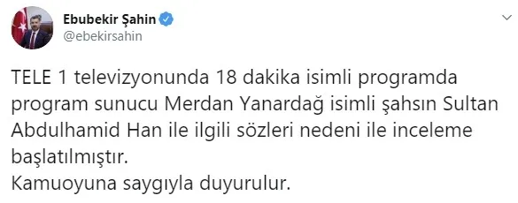 Resmi Twitter hesabından açıklama yapan Şahin, "TELE 1 televizyonunda 18 dakika isimli programda program sunucu Merdan Yanardağ isimli şahsın Sultan Abdulhamid Han ile ilgili sözleri nedeni ile inceleme başlatılmıştır. Kamuoyuna saygıyla duyurulur." ifadelerine yer verdi.