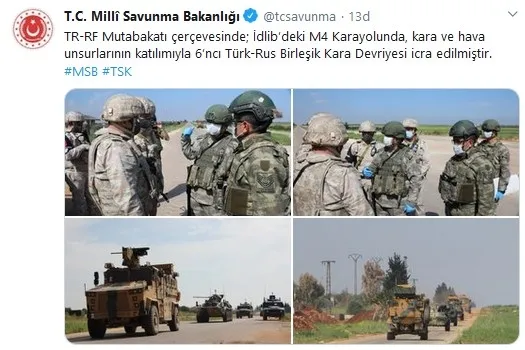 Bakanlığın sosyal paylaşım sitesi Twitter'dan yapılan açıklamada, "Türkiye-Rusya Fedarasyonu mutabakatı çerçevesinde, İdlib'deki M4 Karayolu'nda, kara ve hava unsurlarının katılımıyla 6'ncı Türk-Rus Birleşik Kara Devriyesi icra edilmiştir" denildi.