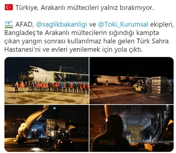 Bangladeş'te Arakanlı mültecilerin yaşadığı kampta çıkan yangın sonrası zarar gören Türk Sahra Hastanesi'nin tekrar hizmete girmesi için hazırlanan yardım malzemelerini taşıyan askeri kargo uçağı Ankara'dan havalandı.
