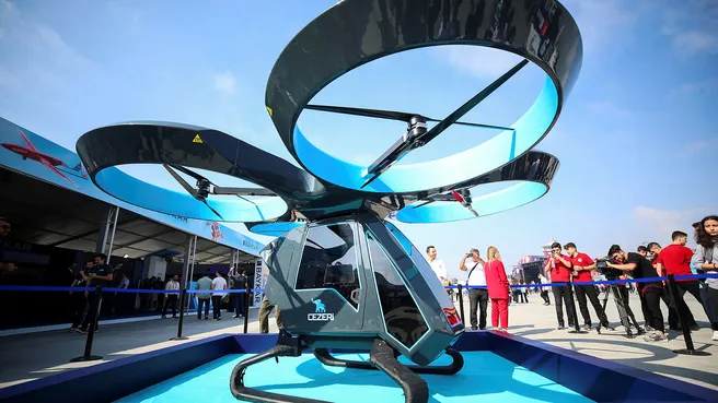 Kentsel hava taşımacılığında köklü bir değişiklik yapacak olan ve yaklaşık olarak 1 saat havada kalabilen Cezeri Uçan Araba da ilk kez TEKNOFEST'TE kamuoyu önüne çıktı.