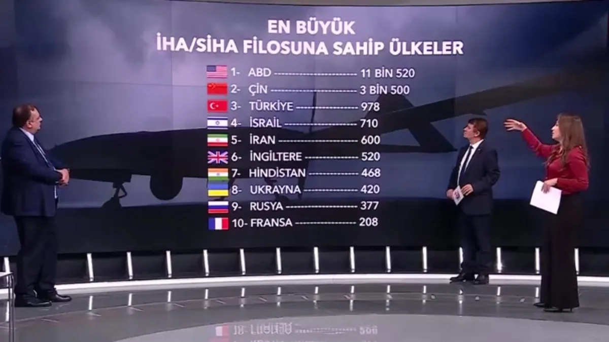 Dünyada insansız hava aracı (İHA) ve silahlı insansız hava aracı (SİHA) sayılarıyla ilgili veriler dikkat çekti. Listenin başında 11 bini aşkın hava aracıyla ABD yer alırken, onu 3 bin 500’le Çin izliyor. Türkiye ise 978 İHA/SİHA’lık filosuyla üçüncü sırada bulunarak dikkat çekici bir konumda. Konuya A Haber ekranlarında değerlendirme getiren uzmanlar, insansız hava araçlarının modern savaş konseptini nasıl dönüştürdüğüne dair önemli analizler paylaştı.