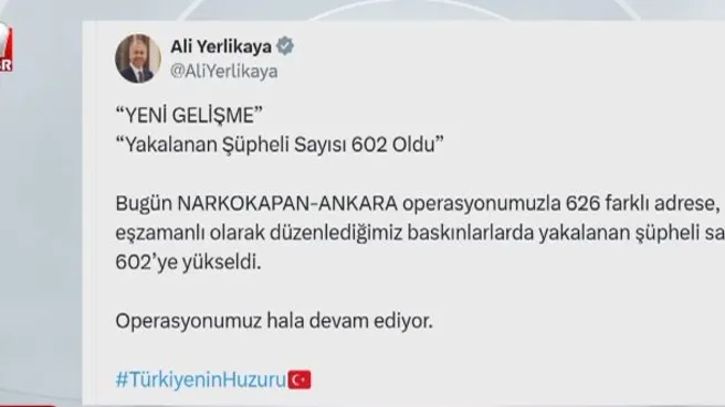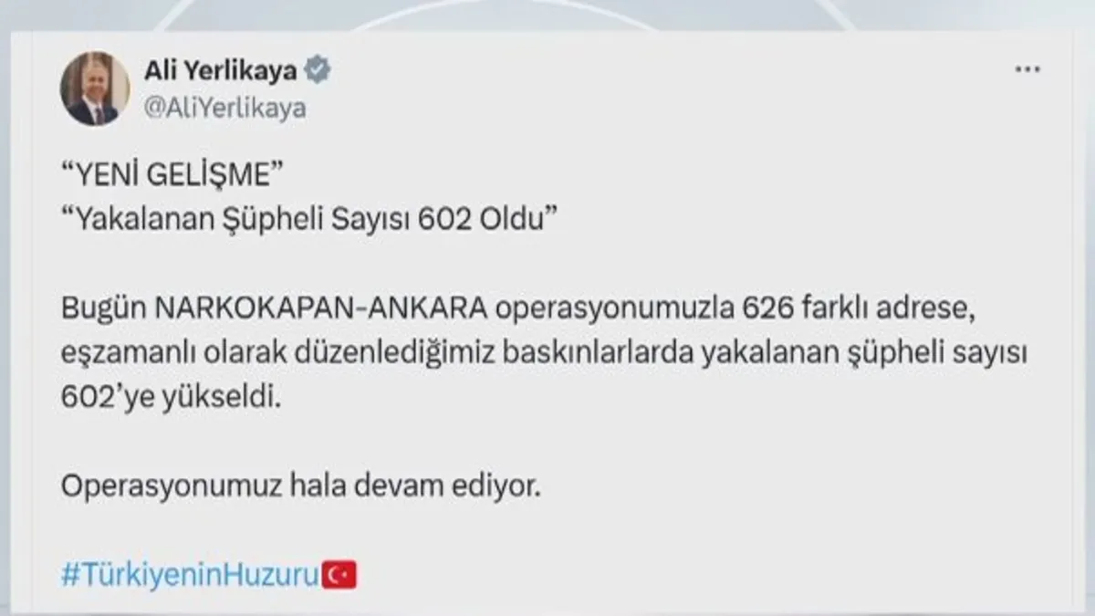 İçişleri Bakanı Ali Yerlikaya, "Narkokapan-Ankara" operasyonunda 602 şüphelinin gözaltına alındığını açıkladı. Türkiye tarihinin en büyük uyuşturucu operasyonu olarak kayıtlara geçen baskınla, zehir tacirlerine büyük darbe vuruldu.