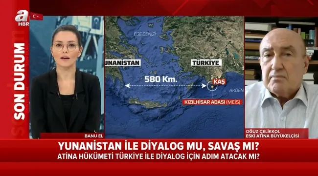 Eski Atina Büyükelçisi Oğuz Çelikkol, A Haber canlı yayınında Türkiye ve Yunanistan arasında son günlerde Doğu Akdeniz'de tırmanan gerilimi değerlendirdi. Yunanistan'ın, Türkiye'ye 2 kilometre uzaklıktaki Kızılhisar (Meis) Adası'nda yasak olmasına rağmen gizlice asker çıkarması ne anlama geliyor? Türkiye'nin 'savaş sebebi' sayarım dediği 12 mil sorunu ne anlama geliyor? Fransa'nın Türkiye'ye karşı gerçekleştirdiği bu tutumun sebebi ne? Doğu Akdeniz'deki bu gerginlik diyalogla mı çözülür yoksa savaşa döner mi? Çelikkol canlı yayında flaş açıklamalarda bulundu.