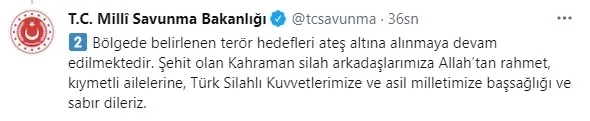 Bakanlık, "Bölgede belirlenen terör hedefleri ateş altına alınmaya devam edilmektedir. Şehit olan Kahraman silah arkadaşlarımıza Allah'tan rahmet, kıymetli ailelerine, Türk Silahlı Kuvvetlerimize ve asil milletimize başsağlığı ve sabır dileriz." mesajını paylaştı.