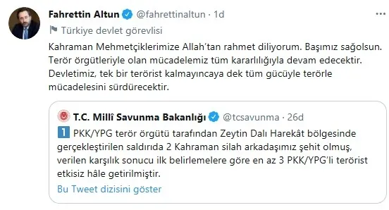 Fahrettin Altun "Kahraman Mehmetçiklerimize Allah'tan rahmet diliyorum. Başımız sağolsun. Terör örgütleriyle olan mücadelemiz tüm kararlılığıyla devam edecektir. Devletimiz, tek bir terörist kalmayıncaya dek tüm gücüyle terörle mücadelesini sürdürecektir." mesajını verdi.