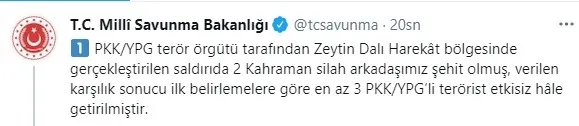 Milli Savunma Bakanlığından yapılan (MSB) son dakika açıklamasında; "PKK/YPG terör örgütü tarafından Zeytin Dalı Harekât bölgesinde gerçekleştirilen saldırıda 2 Kahraman silah arkadaşımız şehit olmuş, verilen karşılık sonucu ilk belirlemelere göre en az 3 PKK/YPG'li terörist etkisiz hâle getirilmiştir." ifadelerine yer verildi.