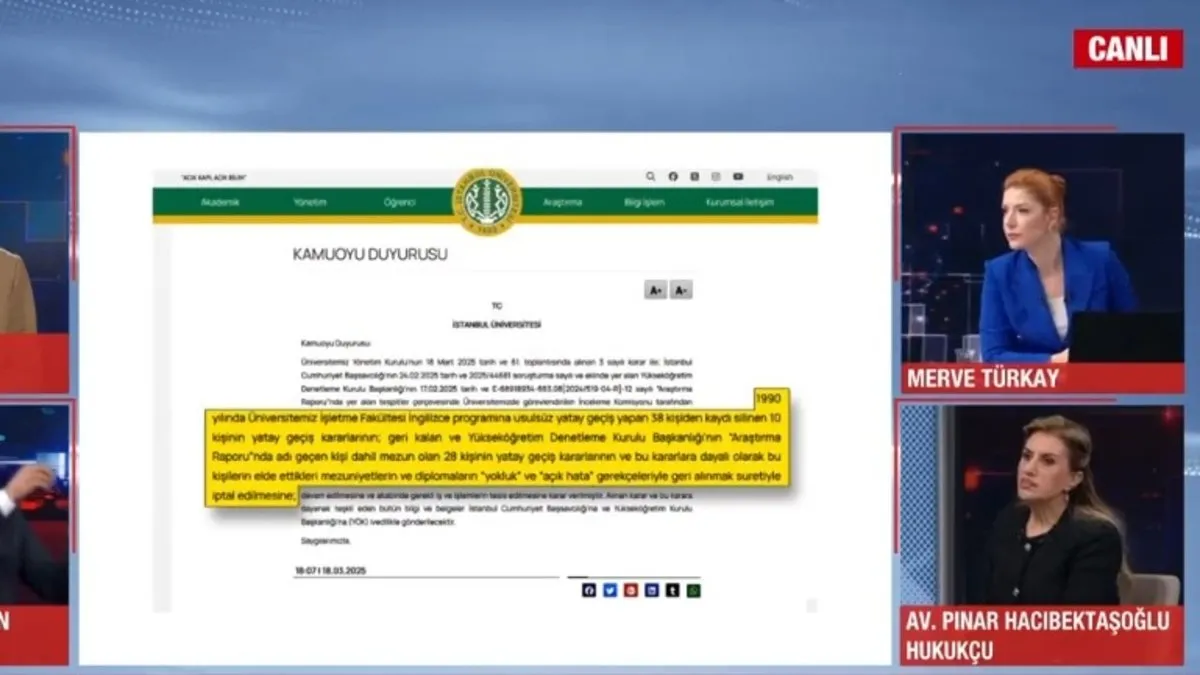 A Haber’de yayınlanan Memleket Meselesi programında 18 Mart 2025 tarihli yayınında "İmamoğlu'nun diploması iptal edildi, Belgeler savcılık ve YÖK'e gönderilecek, İmamoğlu dahil 28 kişinin diploması iptal" başlıkları ele alındı...