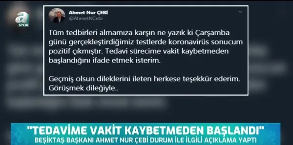 Corona virüsü testi pozitif çıkan Beşiktaş Başkanı Ahmet Nur Çebi, sosyal medya hesabından açıklamalarda bulundu.