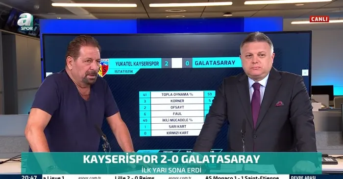 Süper Lig'in 6. hafta karşılaşmasında Galatasaray, Yukatel Kayserispor ile deplasmanda karşı karşıya geldi. Maçın ilk yarısını 2-0 geride kapatan konuk ekiple ilgili devre arasında A Spor yorumcusu Erman Toroğlu sert eleştirilerde bulundu. Toroğlu canlı yayında şu ifadeleri kullandı: Galatasaray top oynamıyor. Kayserispor çok akıllı oynuyor. Kayseri daha takım gibi oynuyor, Galatasaray ise bireysel oynuyor."