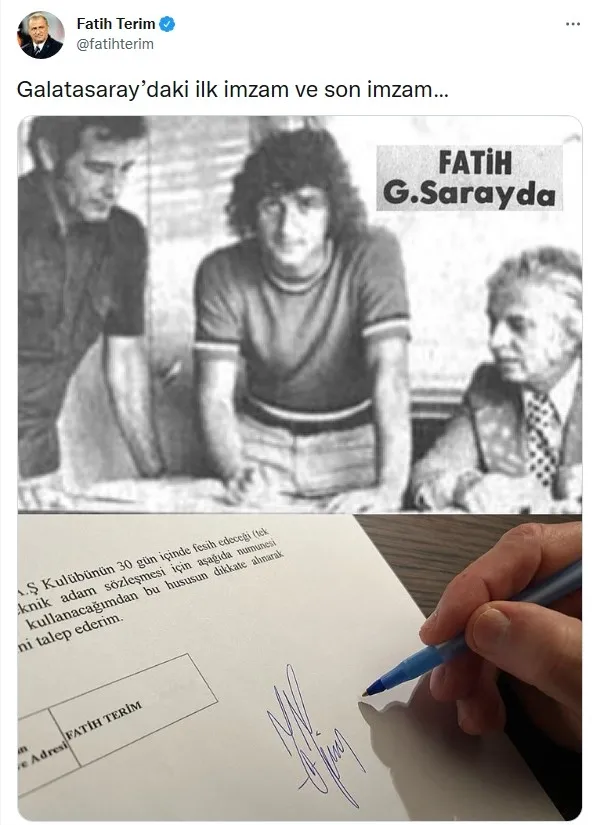 Deneyimli çalıştırıcı sosyal medya hesabından iki fotoğraf paylaşarak, "Galatasaray'daki ilk imzam ve son imzam..." notunu düştü.