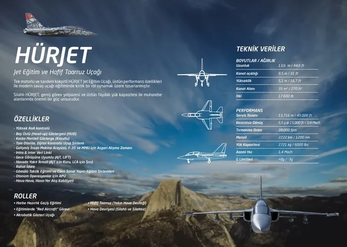 HÜRJET Jet Eğitim ve Hafif Taarruz Uçağı, tek motorlu, tandem ve modern aviyonik suite sahip kokpiti ile üstün performans özelliklerini kullanarak kritik rol oynamak üzere tasarlanmıştır.