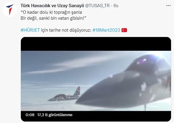 Açıklamada, ''O kadar dolu ki toprağın şanla Bir değil, sanki bin vatan gibisin!" HÜRJET için tarihe not düşüyoruz: 18 Mart2023'' denildi.