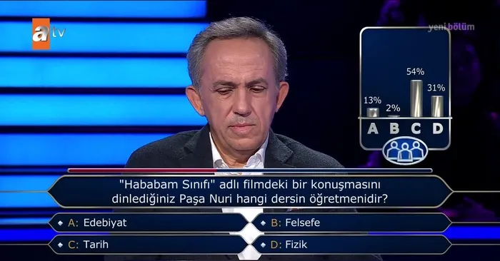 Kenan İmirzalıoğlu'nun sunumuyla ATV ekranında 03 Aralık 2021 - Cuma akşamı yayınlanan bilgi yarışması "Kim Milyoner Olmak İster" yine ses getirdi. Yeşilçam'ın efsane filmlerinden "Hababam Sınıfı" ile ilgili bir soruya ise doğru yanıt veremeyen yarışmacı 'yok artık' dedirtti. Yarışmacı bu soruda seyirci joker hakkını kullandı. Seyircilerin çoğunluğu soruya doğru yanıt veremedi. İşte sosyal medyada çok konuşulan o soru ve yanıtı...