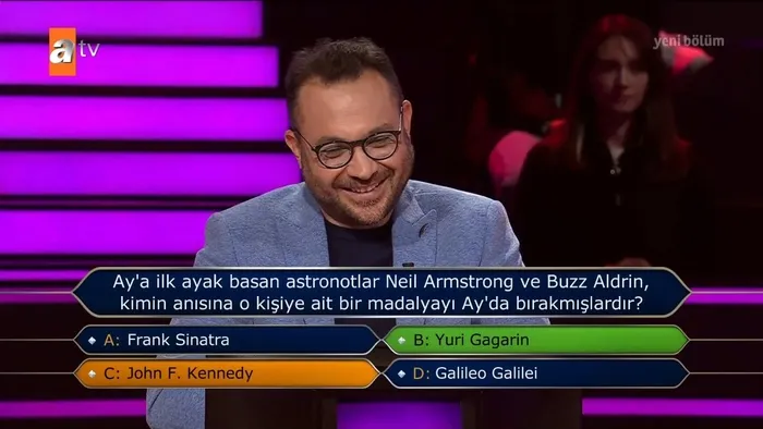 ATV ekranlarının Kenan İmirzalıoğlu'nun sunumuyla ekrana gelen fenomen bilgi yarışması Kim Milyoner Olmak İster'in yeni bölümüne 200.000 TL'lik uzay sorusu damga vurdu. Yeni bölümde yarışmaya fırtına gibi giren yarışmacı soruları bir bir bilerek 200.000 TL ödüle sahip soruyu görme şansına erişti. Yarışmacıya ''Ay'a ilk ayak basan astronotlar Neil Armstrong ve Buzz Aldrin, kimin anısına o kişiye ait bir madalyayı Ay'da bırakmışlardır?'' sorusu yöneltildi. Bakın yarışmacının cevabı ne oldu! İşte Milyoner'in 31 Ekim 2021 - Pazar akşamı yayınlanan yeni bölümüne damga vuran o soru ve yarışmacılara yöneltilen tüm sorular...