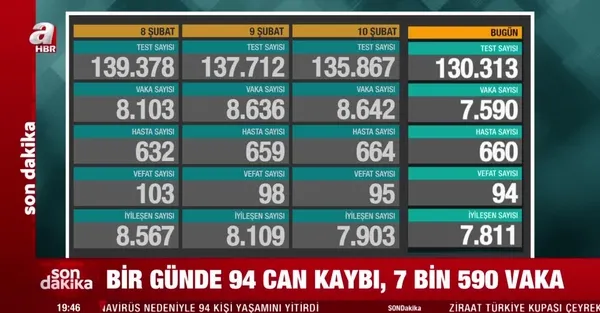 Sağlık Bakanlığı Türkiye'nin 11 Şubat 2021 Perşembe günüe ait koronavirüs tablosunu açıkladı. Son 24 saatte 130 bin 313 Kovid-19 testi yapıldı, 7 bin 590 kişinin testi pozitif çıktı, 94 kişi hayatını kaybetti. Ağır hasta sayısı 1256 oldu, 7 bin 811 kişinin Kovid-19 tedavisinin/karantinasının sona ermesiyle iyileşen sayısı 2 milyon 453 bin 96'ya yükseldi. İşte Türkiye'nin koronavirüs ile mücadelesindeki son durumu...