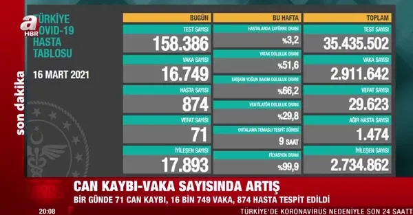 16 bin 749 yeni vaka var! Sağlık Bakanlığı 16 Mart 2021 Kovid-19 vefat vaka test sayısı iyileşen tablosunu paylaştı