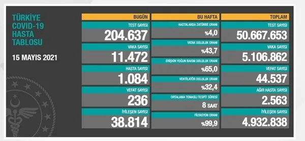 Bugün yapılan 217 bin 276 testten, 11 bin 937 yeni vaka sayısı, 916 kişi de yeni hasta sayısı olduğu belirtildi. Toplam vaka sayısının 5 milyon 139 bin 485 olduğu, bugün iyileşen 10 bin 125 kişiyle birlikte toplam iyileşen hasta sayısının 4 milyon 971 bin 245'e yükseldiği, toplam hastalarda zatürre oranının yüzde 3,2, ağır hasta sayısının ise 2 bin 232 olduğu açıklandı.