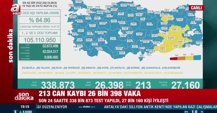 Sağlık Bakanlığı tarafından Türkiye'nin yeni korona virüs tablosu açıklandı. 19 Eylül'de açıklanan 24 saatlik verilere göre 26 bin 398 vaka tespit edildi. Virüs nedeniyle hayatını kaybedenlerin sayısı 213 oldu. Bir günde toplam 338 bin 873 test yapılırken, iyileşen hasta sayısı 27 bin 160 olarak kaydedildi.