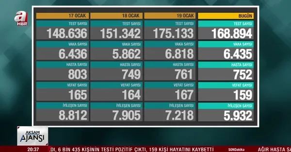 Sağlık Bakanlığı'nca duyurulan 'Türkiye Covid- 19 Hasta Tablosu'na göre; son 24 saatte yapılan 168 bin 894 testten 6 bin 435 vaka, 752 hasta tespit edildi. Virüs nedeniyle 159 kişi hayatını kaybederken, 5 bin 932 kişi de iyileşti. Bugünkü verilerle toplam test sayısı 27 milyon 867 bin 450, toplam vaka sayısı 2 milyon 406 bin 216, toplam vefat sayısı 24 bin 487, toplam ağır hasta sayısı 2 bin 102, toplam iyileşen hasta sayısı 2 milyon 283 bin 919 oldu.