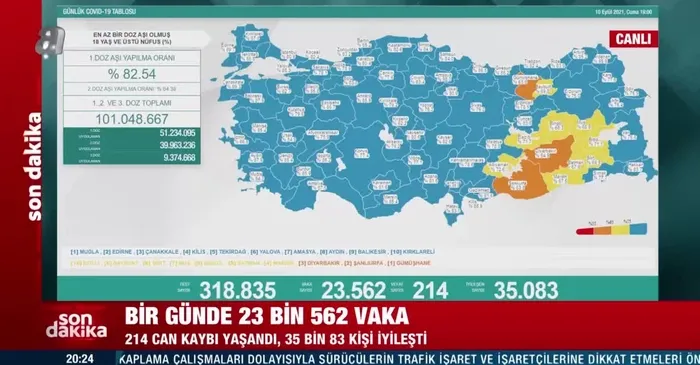 Sağlık Bakanlığı'nın güncellediği koroanvirüs verilerini Sağlık BakanıFahrettin Koca Twitter'dan paylaştı. Güncel tabloya göre Türkiye'de son 24 saatte 318 bin 835 korona testi yapıldı, 23 bin 562 kişinin testi pozitif çıktı, 214 kişi hayatını kaybetti. Koca paylaşımını, "Vaka sayımız 23.562. Dün 257 olan can kaybımız bugün 214. Vakaların seyrinde bariz düşüş yok. Can kaybı sayısındaki azalma şu an için umut verici. Ama bu, yarın tersi de muhtemel bir durum. Salgın ortamında, aşıyla geri dönüşü olmayan adımlar atmalıyız. Tedbirler yol arkadaşımız." ifadeleiyle yaptı.