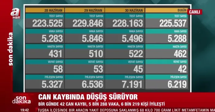Sağlık Bakanlığı, son 24 saatte 42 kişinin korona virüsten hayatını kaybettiğini, 5 bin 288 yeni vaka sayısının olduğunu açıkladı. Son dakika gelişmesinin ayrıntıları haberimizde...
