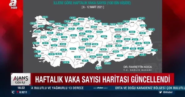 İllere göre son bir haftada 100 bin kişide görülen Kovid-19 vakası sayısı açıklandı. Buna göre vaka sayısı her 100 bin kişide İstanbul'da 178,25 Ankara'da 68,53 İzmir'de 78,57 oldu. En yüksek vaka sayısı Samsun, en düşük vaka sayısı ise Siirt'te kayda geçti. Sağlık Bakanı Fahrettin Koca ise 81 ilin 6-12 Mart koronavirüs risk haritası sonrası ilk paylaşımında 'tedbir' uyarısında bulundu.