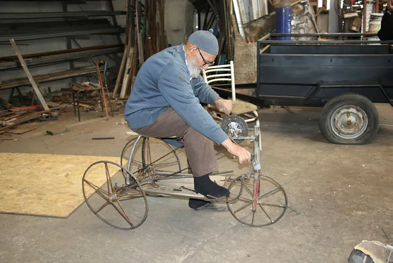 Mehmet dedenin bütün işlerini kendisinin yaptığını belirten damadı Aziz Kaya,"Bir gün evde otururken böyle bir şey yapacağım ben dedi. Bende dedim ki ben sana elektrikli bir motor alıyım, o da buna hiç itibar etmemiş bir baktım bir 12'lik demir omuzlamış birkaç tane parça almış gelmiş, geldi buraya ilk önce evine götürmüş. Oradan buraya getirdik, burada başladı. Kendisi kesiyor, biçiyor, ekiyor yalnız kaynak yerine oğlum var benim ona şurayı kaynatıver diyor. Orayı söylüyor o kaynatıveriyor. Uyku uyuyamıyor zaten aşağı yukarı sabaha yakın falan ancak uyuyabiliyor . Öyle bir problemi var. Orada burada şöyle yapsam, böyle yapsam diyor. Bisikleti merak edip kalkıp gidiyorlar hele hele cami cemaatinden birisi var. Mutlaka o da sanatkar, o da merak ediyor olur mu olmaz mı diye öyle o da geliyor. Daha onun gibi böyle çevre esnaf arkadaşlar geliyor. Cuma günleri namaza gidiyor Cuma günleri hiç gelmiyor. Geliyor biraz bir kısmını yapıyor ondan sonra biraz dinleniyor. 93 yaşındaki adam biraz bitkin oluyor. Hal böyle olunca tam faal çalışamıyor" dedi