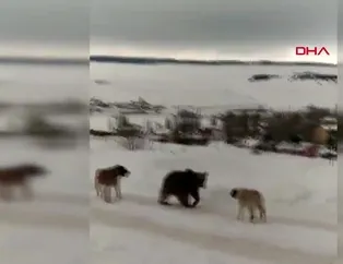 Aç kalan ayının köpeklerle mücadelesi