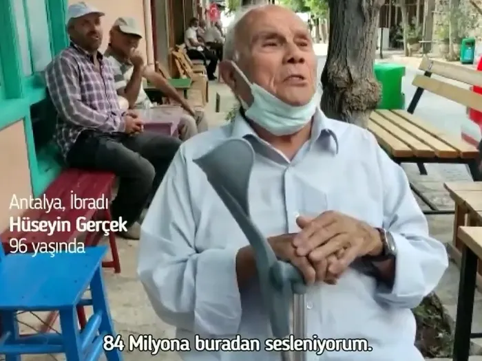 "Cesaret insanı aslana galip eder. Herkesi aşıya davet ediyorum. Ben faydasını gördüm.' 96 yaşındaki Hüseyin amca size ve 84 Milyona sesleniyor."