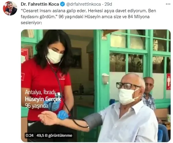 Sağlık Bakanı Fahrettin Koca, Twitter hesabından Antalya'da yaşayan 96 yaşındaki Hüseyin Gerçek'in videosunu paylaştı.