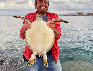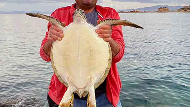 Muğla'nın Datça ilçesi liman mevkiinde kenardan balık avlayan Necati Özaçar ve Ekrem Korkmaz, kayaların arasında ip ve naylon poşetlere dolanmış bir Caretta Caretta deniz kaplumbağası gördü.