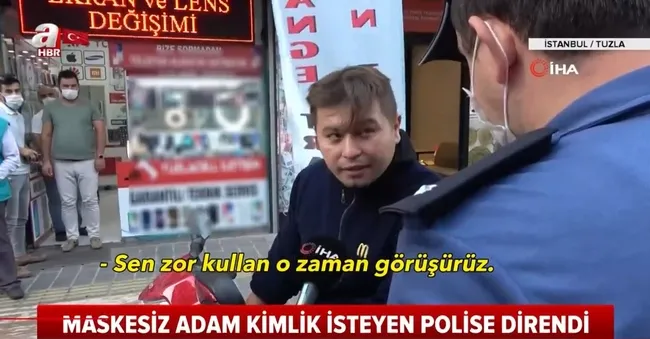 Maske takmayan bir şahıs, koronavirüs tedbileri kapsamından kendisine ceza kesmek için kimlik isteyen polis memuruna kimliğini vermedi. Polisin kimliğini vermemekte ısrar etmeye devam etmesi halinde zor kullanmak zorunda kalacağını söylemesi üzerine ise bu kez polise "Sen zor kullan o zaman görüşürüz" diyerek tehditler savurdu.