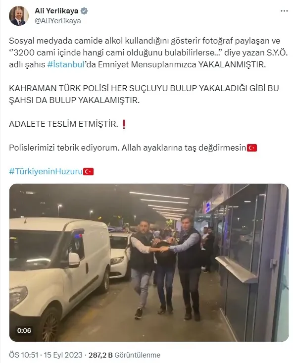 "Sosyal medyada camide alkol kullandığını gösterir fotoğraf paylaşan ve '3200 cami içinde hangi cami olduğunu bulabilirlerse...' diye yazan S.Y.Ö. adlı şahıs İstanbul'da emniyet mensuplarımızca yakalanmıştır. Kahraman Türk polisi her suçluyu bulup yakaladığı gibi bu şahsı da bulup yakalamıştır, adalete teslim etmiştir. Polislerimizi tebrik ediyorum. Allah ayaklarına taş değdirmesin."