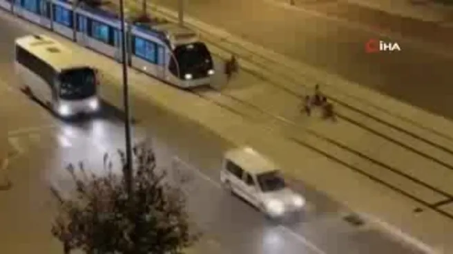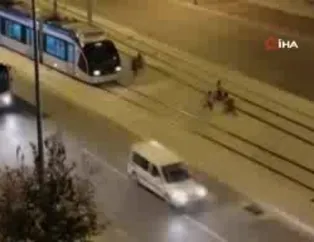 Çocuklardan biri şehir merkezi istikametine ilerleyen tramvayın önüne aniden atlayıp yürekleri ağza getirirken, bir süre de önünde durdu. Vatmanın çaldığı sirene aldırış etmeyen çocuklar bir süre tramvayın ilerlemesini engelledi.
