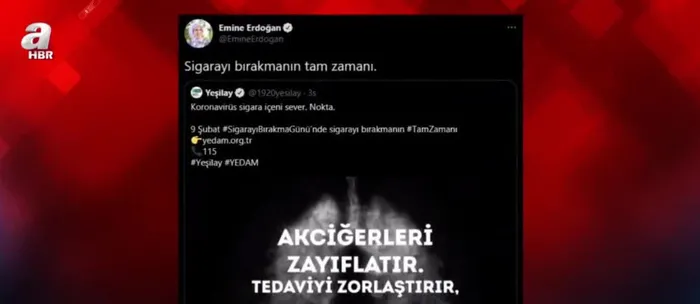 Başkan Recep Tayyip Erdoğan'ın eşi Emine Erdoğan, "sigarayı bırakmanın tam zamanı" başlığı altında 9 şubat sigarayı bırakma günü dolayısıyla Yeşilay'ın anlamlı bir videosunu paylaştı.