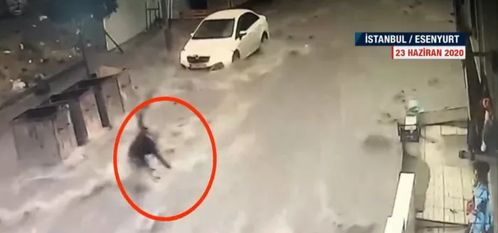 Görüntülerdeki kadın ise sel sularına kapılmaktan son anda yetişen esnaf tarafından kurtarılmıştı.