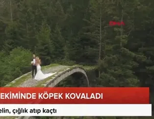 Rize’de, doğada düğün fotoğrafı ve klip çektiren Beyza Şimşek ile Çağlar Paliç'i, havalanan drone’a yönelen çoban köpeği kovaladı. Bu anlar, kameraya yansıdı. Karadenizli müzisyen Çağlar Paliç ile Beyza Şimşek, Çamlıhemşin ilçesinde doğada düğün fotoğrafları çektirdi. Çat Kemer Köprüsü’ne çıkan çift, görüntü alan drone’a poz verdi. Bu sırada drone sesinden ürken çoban köpeği, köprüdeki çiftin üzerine doğru koşmaya başladı. Paniğe kapılan gelin, çığlık atıp kaçtı. Bu anlar, görüntü alan Memiş Ali Yazıcı’nın drone kamerasına yansıdı.