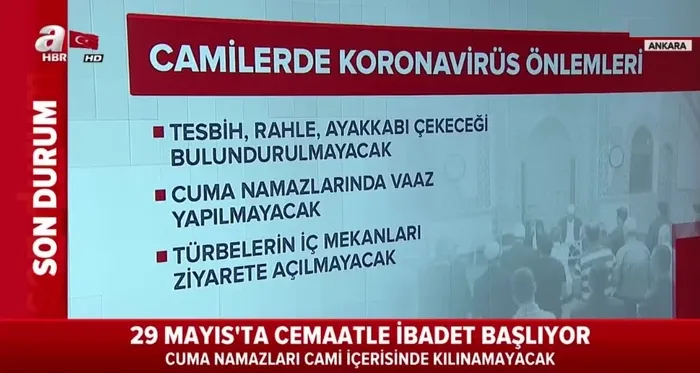 Gelinen aşamada pazartesi günü Cumhurbaşkanı Sayın Recep Tayyip Erdoğan Başkanlığında toplanan Kabine Toplantısı'nda cami ve mescitlerin cemaatle ibadete açılmasına yönelik alınacak tedbirlerin değerlendirildiği belirtilerek, Bilim Kurulunun önerileri doğrultusunda 29 Mayıs 2020 Cuma günü belirlenecek kurallar çerçevesinde öğle, ikindi ve cuma namazlarının camilerde cemaatle kılınabileceğine ilişkin karar alındığı ifade edildi.