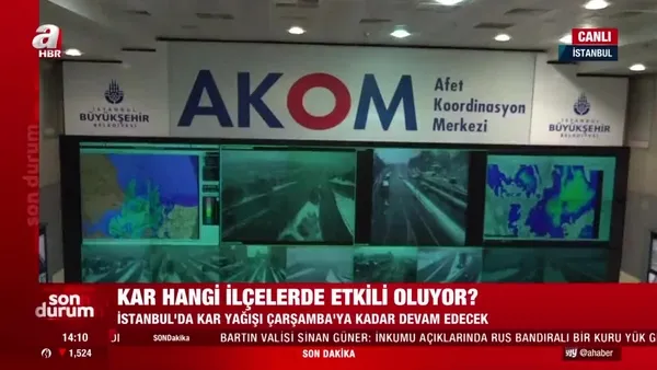 İstanbul'da dün geceden itibaren etkisini arttıran kar yağışı yolları beyaza bürüdü. Peki kar yağışı en çok hangi ilçelerde etkili oldu? Kar yağışı ne kadar sürecek? Yollarda son durum nasıl? A Haber muhabiri Melis Coşan AKOM'dan (Afet Koordinasyon Merkezi) canlı yayında son gelişmeleri aktardı.