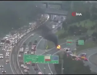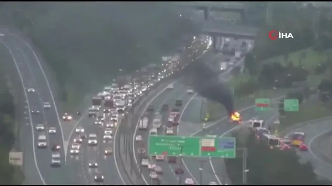 İstanbul'da minibüsün çarptığı araç alev topuna döndü! TEM Otoyolu'nda uzun kuyruklar oluştu
