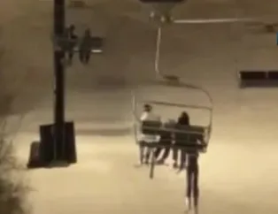 ABD'de kayakçıları taşıyan bir telesiyejde arıza meydana geldi. Mahsur kalanları kurtarma çalışmasında, atlamak isteyen bir kişinin montu demire takıldı. İşte asılı kalan kayakçının o zor anları.
