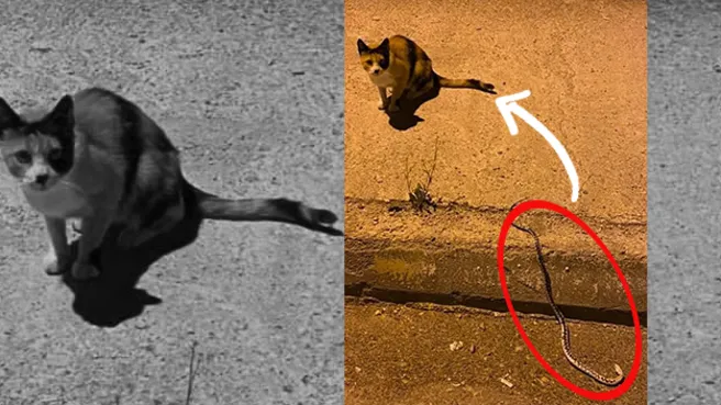 Görüntülerde, kedinin yılana saldırması ve yılanın hareketsiz kalması yer alıyor.