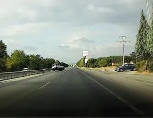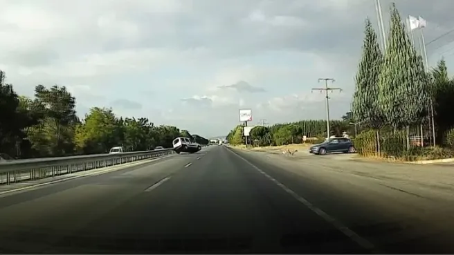 Balıkesir'de seyir halindeki aracın sürücü, yola fırlayan köpeği ezmemek için yaptığı manevra sonucu takla attı. Aracın içerisinde bulunan 2 kişinin sağlık durumlarının iyi olduğu bildirilirken, o anlar ise araç kamerasına yansıdı.