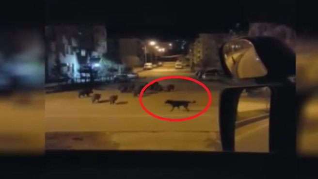 Tunceli'de aç kalan domuz sürüsü kent merkezine girdi. Bir sokak köpeği domuz sürüsüne saldırdı. O anlar yoldan geçen bir vatandaş tarafından görüntülendi.