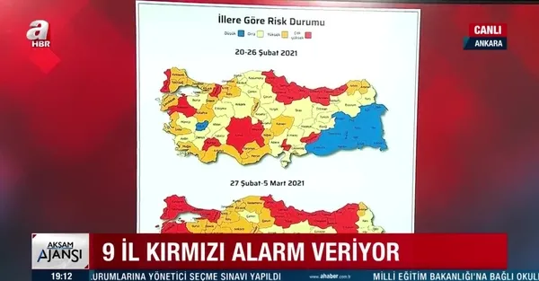 Sağlık Bakanlığı Koronavirüs Bilim Kurulu normalleşme için belirlediği kriterler ışığında Türkiye vaka oranı ve risk durumu verilerini 20-26 Şubat 2021 tarihli olarak güncelledi. A Haber muhabiri Ece Altuğ, güncel koronavirüs risk haritasının pazartesi günü Recep Tayyip Erdoğan'ın başkanlığında gerçekleştirilecek Kabine toplantısı sonrası açıklanacağını söyledi.