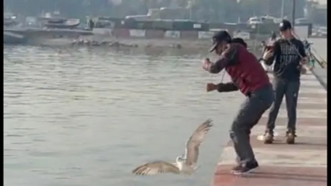 Son dakika haberi... Mersin'de sahilde balık tutan bir vatandaşın oltasına, martı takıldı. Balık için atılan oltaya takılan martı, vatandaş tarafından sahile çıkartılarak kurtarıldı.