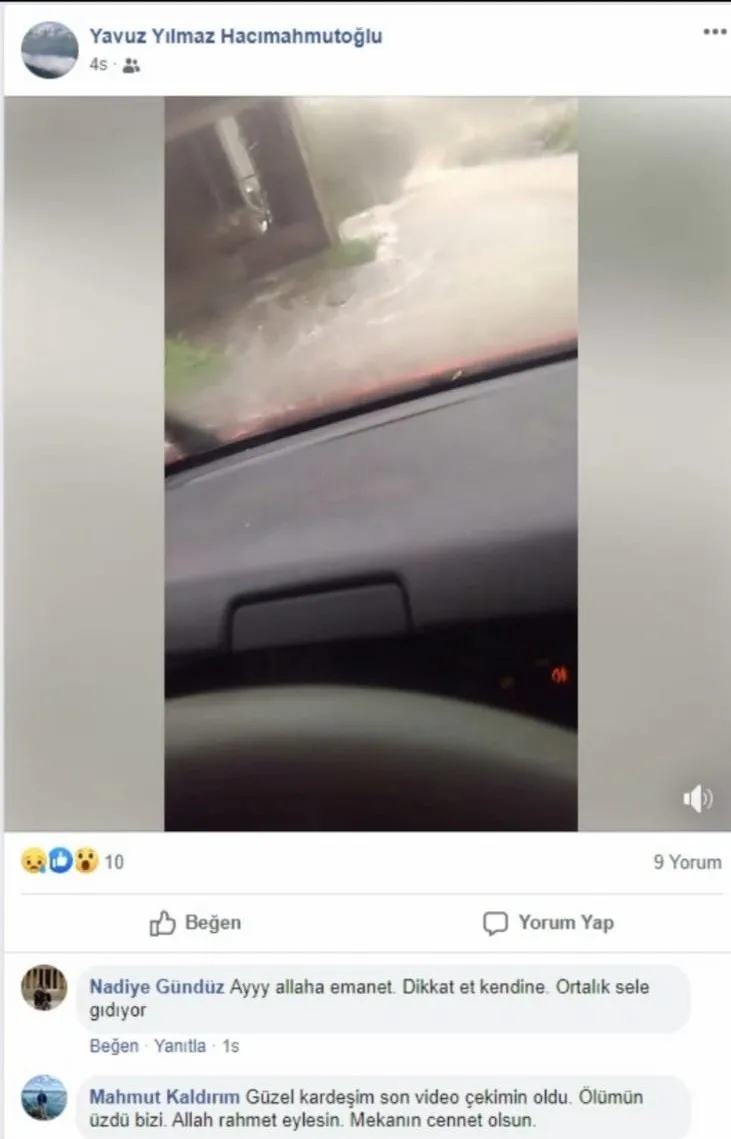Trabzon'un Of ilçesinde şiddetli yağış sonrası yaşanan heyelanda aracıyla toprak altına kalarak hayatını kaybeden Yılmaz Hacımahmutoğlu (53) vefat etmenden önceki son anlarına ait görüntüleri sosyal medya hesabı üzerinde paylaştığı ortaya çıktı.