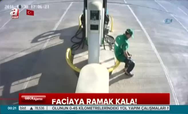 Ölümden son anda kurtuldu Muğla'nın Bodrum ilçesinde bir akaryakıt istasyonuna giren otomobil akaryakıt pompasına çarptı. O anlar güvenlik kameralarınca saniye saniye kaydedildi.